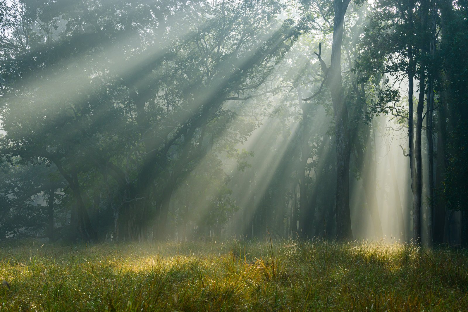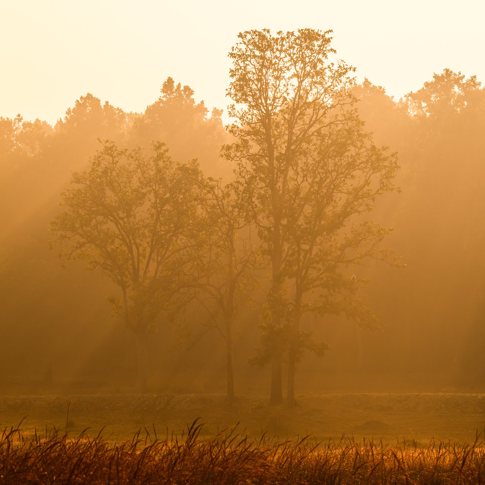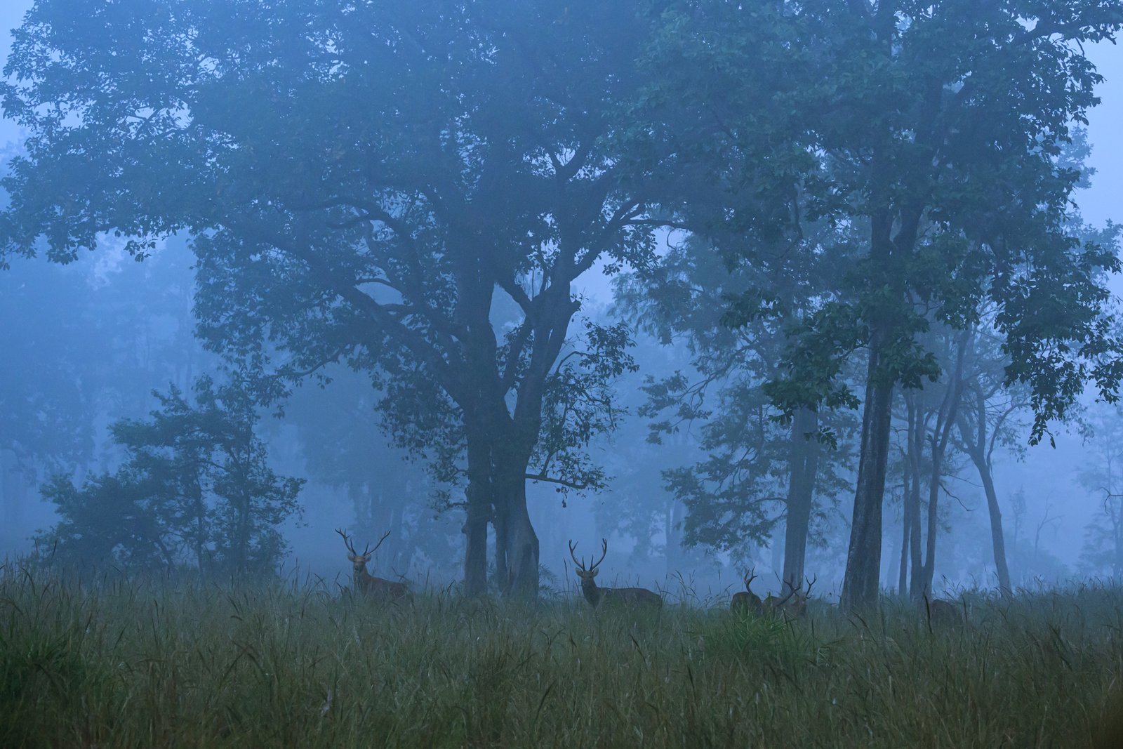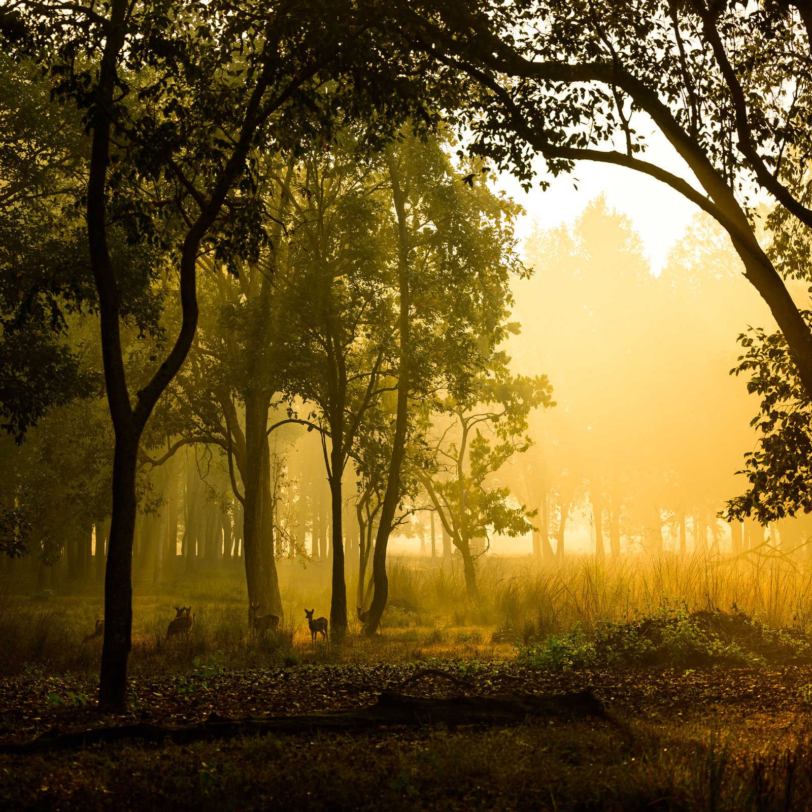 Soft mist drifting across the meadows, crisp light filtering through sal forests and calm wildlife patterns — ideal for refined safaris and atmospheric photography.